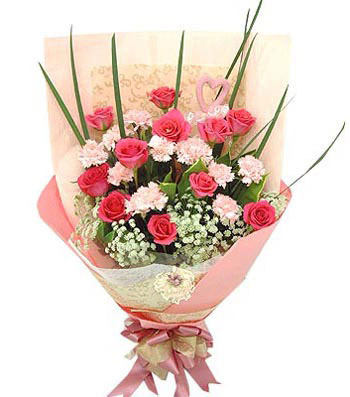 - 花材:11枝粉色康乃馨,11枝红玫瑰,满天星绿叶搭配。(时令配材没货用其他代替)