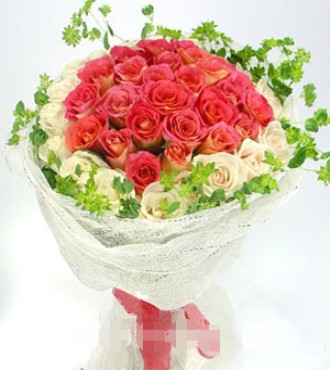 - 花材:31朵红玫瑰、20朵白玫瑰、绿叶外围丰满搭配