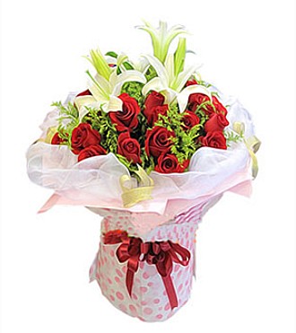 - 花材:19枝红玫瑰,2枝多头白色香水百合,黄莺丰满。